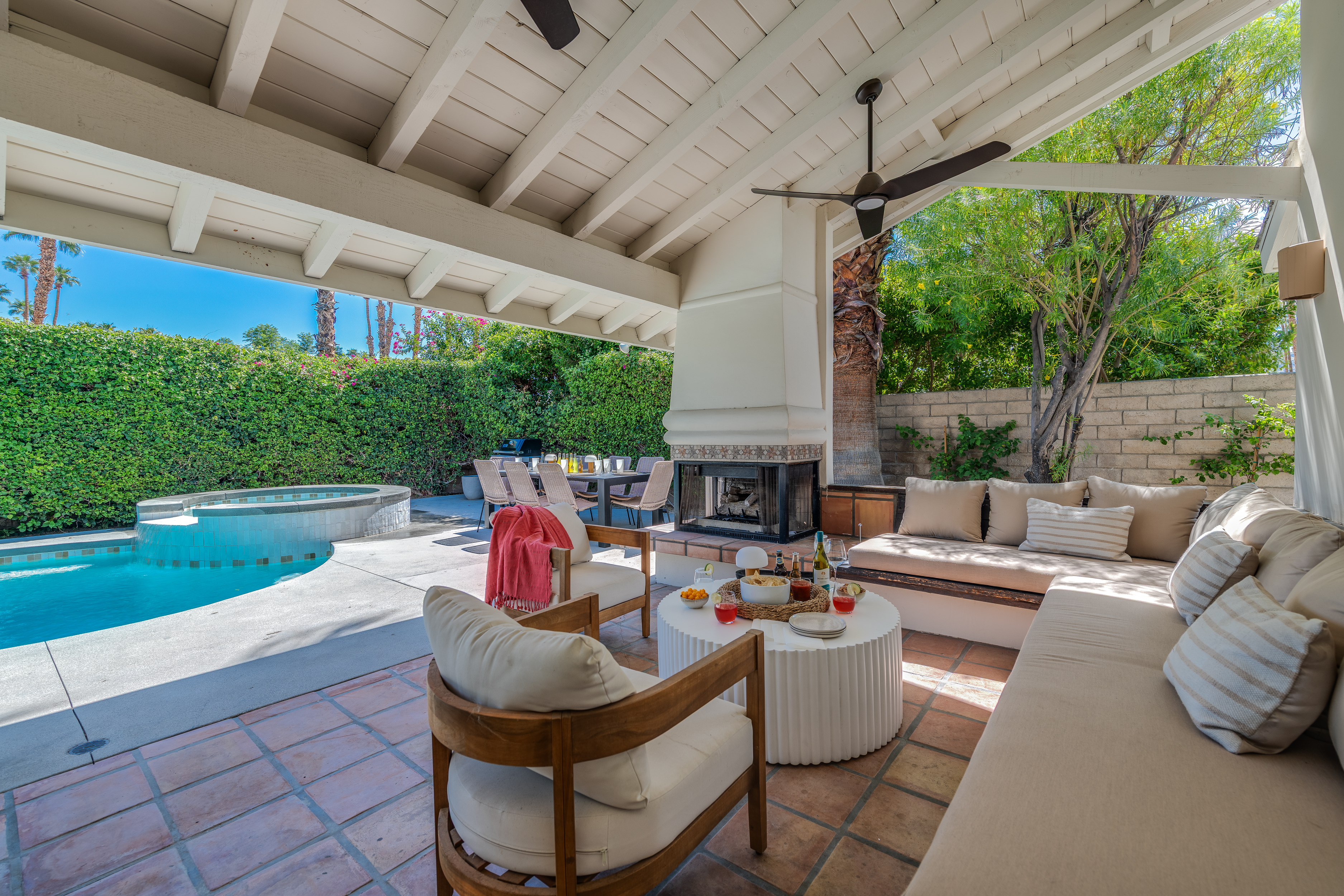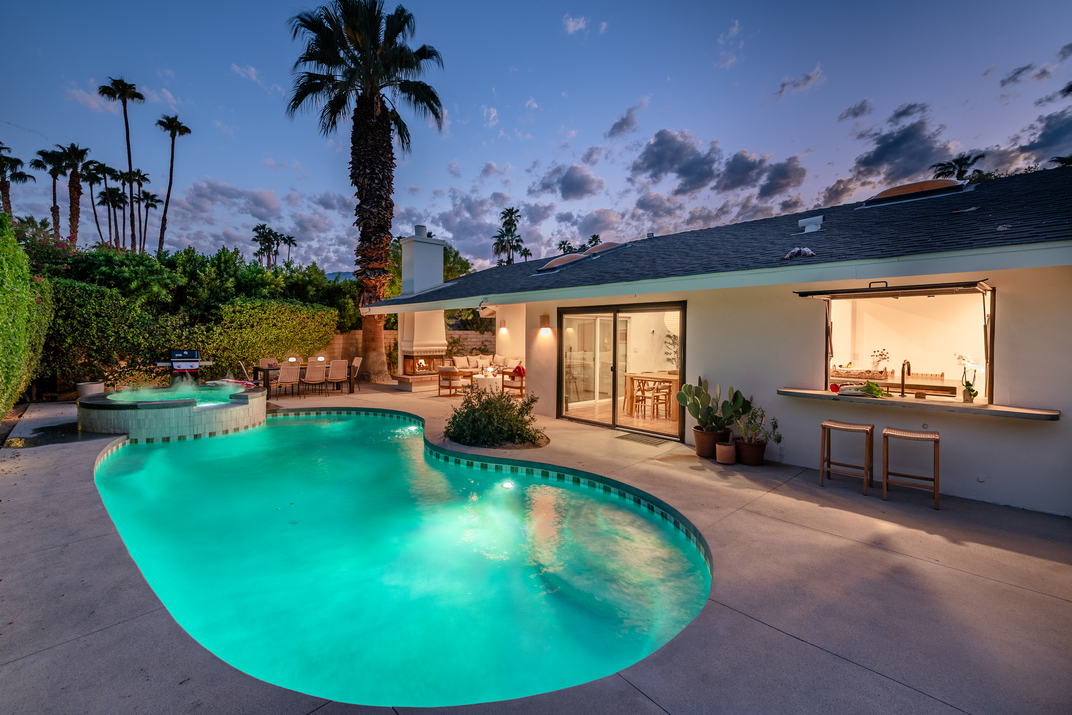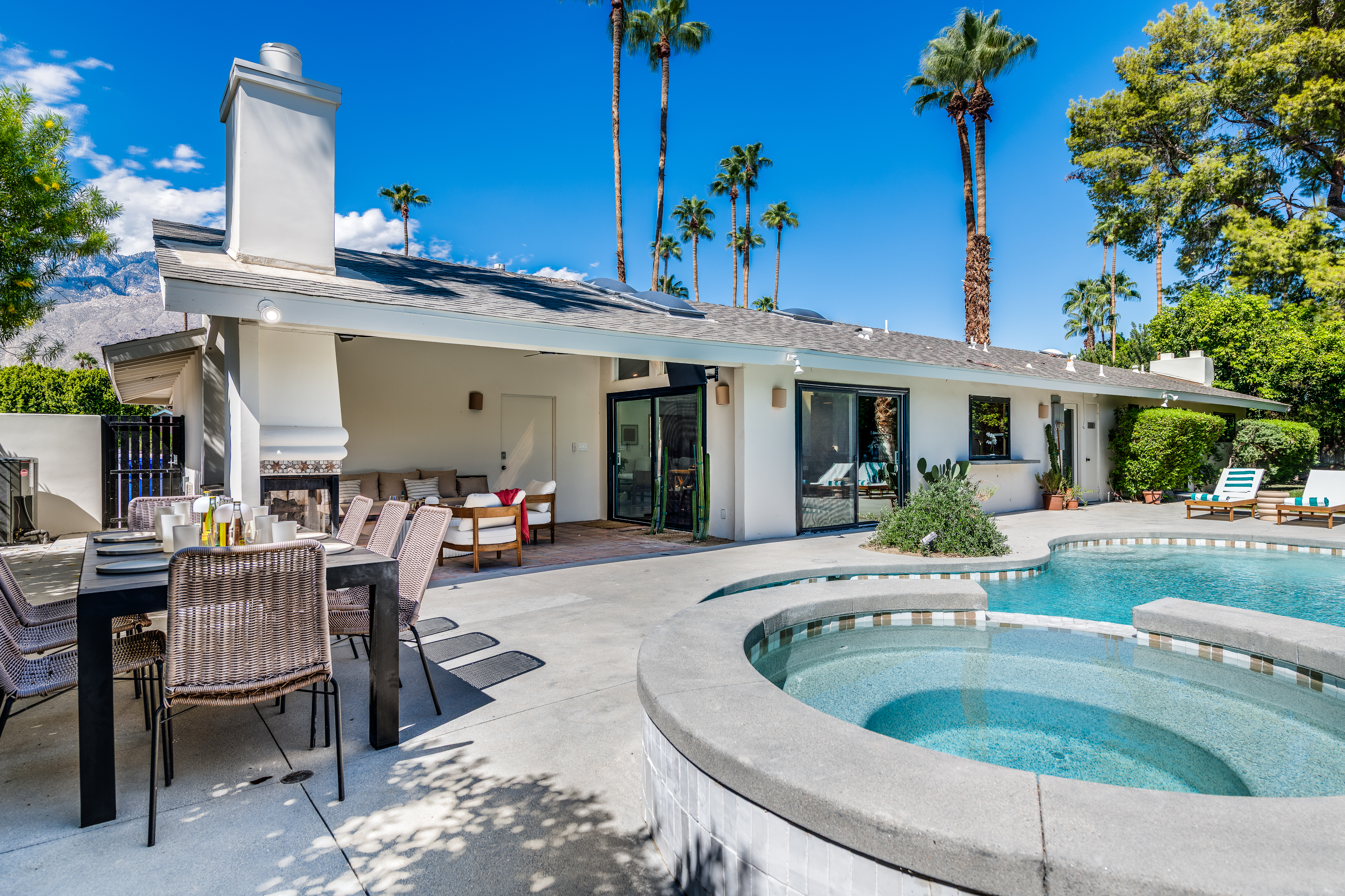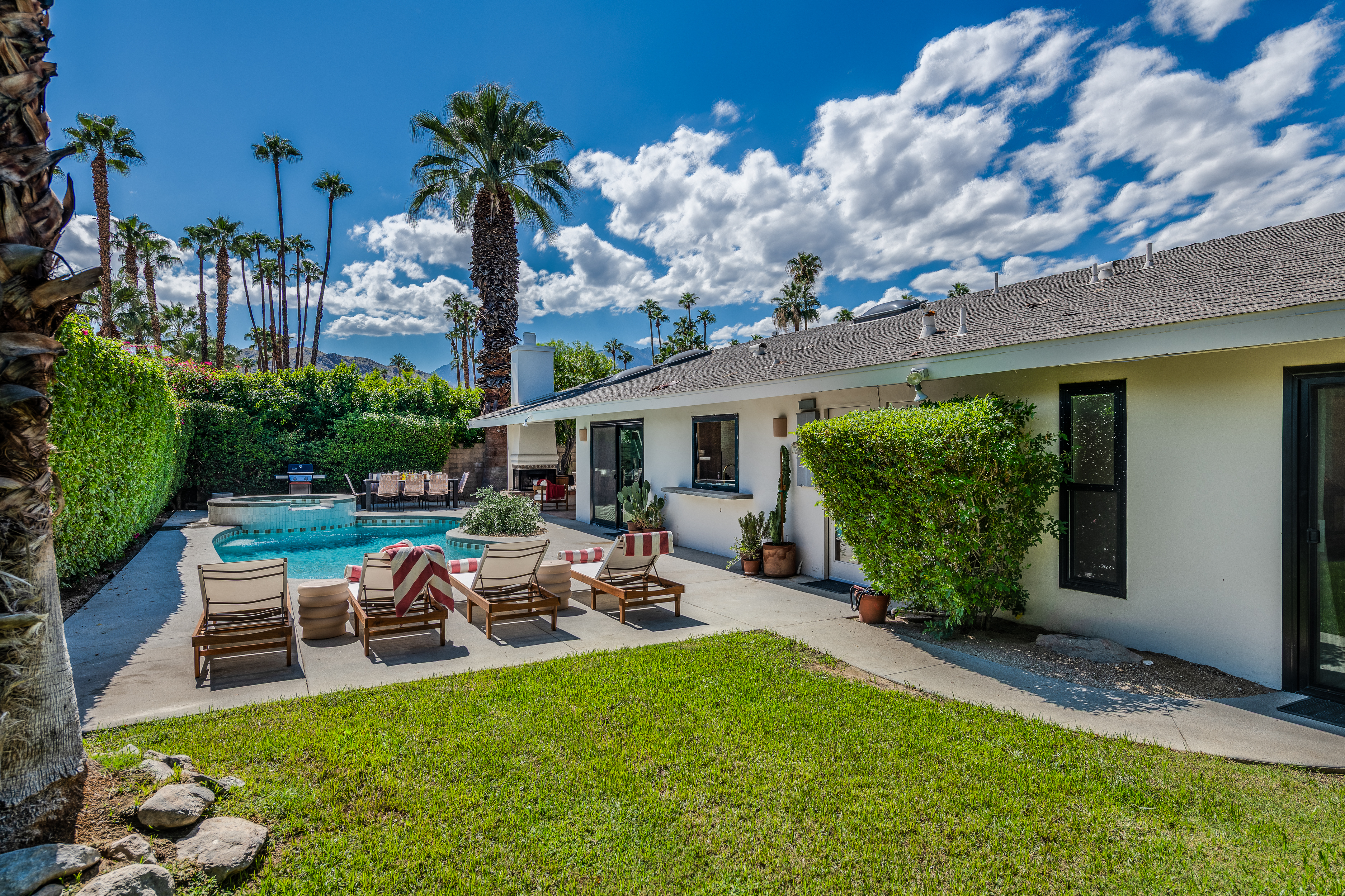 The home features 4 bedrooms, 3 baths and has been remodeled to embrace the original ranch design but is outfitted with modern comforts. The home offers indoor/outdoor living with a pass through window over the kitchen sink so poolside entertaining isn't neglected. That is coupled with multiple sliding doors to the pool and a gracious covered patio with an outdoor fireplace. Relaxed evenings are inevitable. The sparkling pool is just steps away from the house, paired with poolside dining and the hot tub offers very strong jets for any aches earned after golf or tennis.