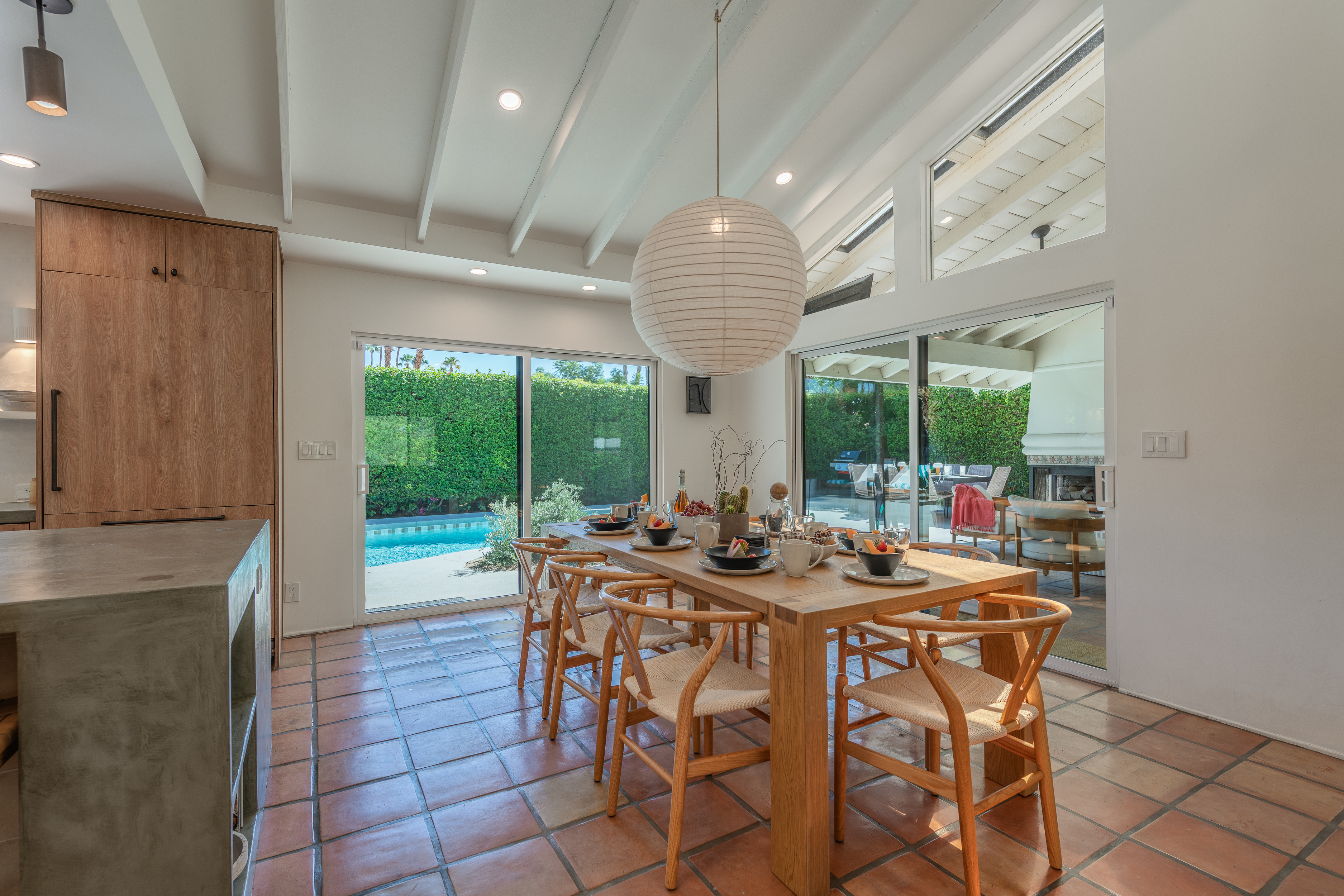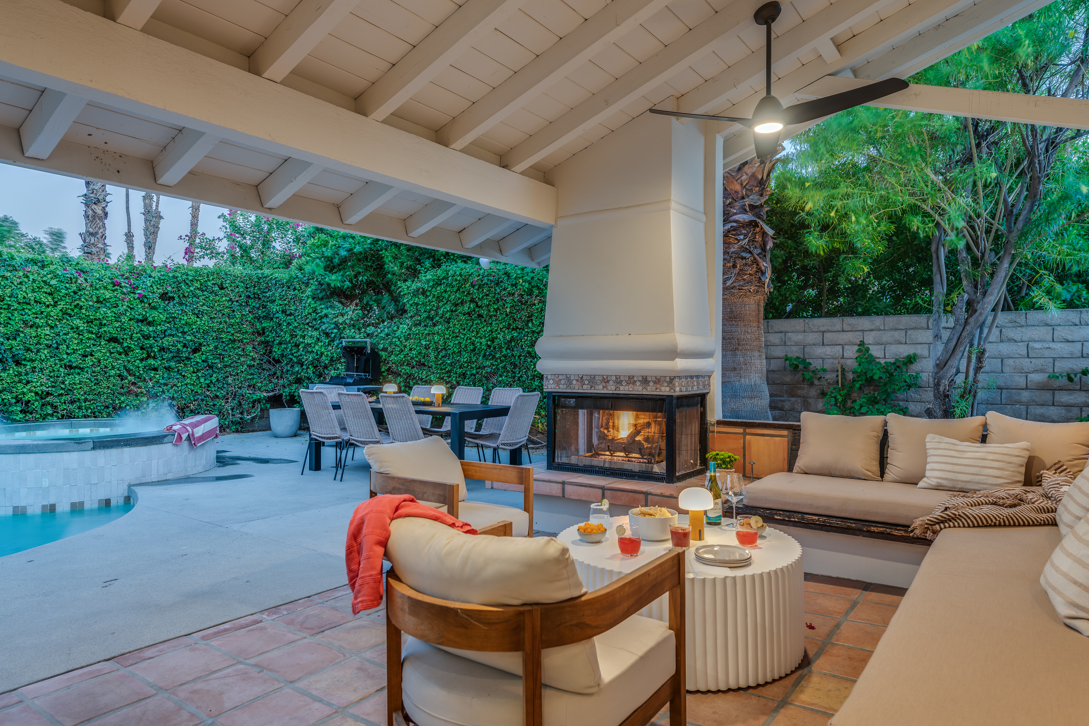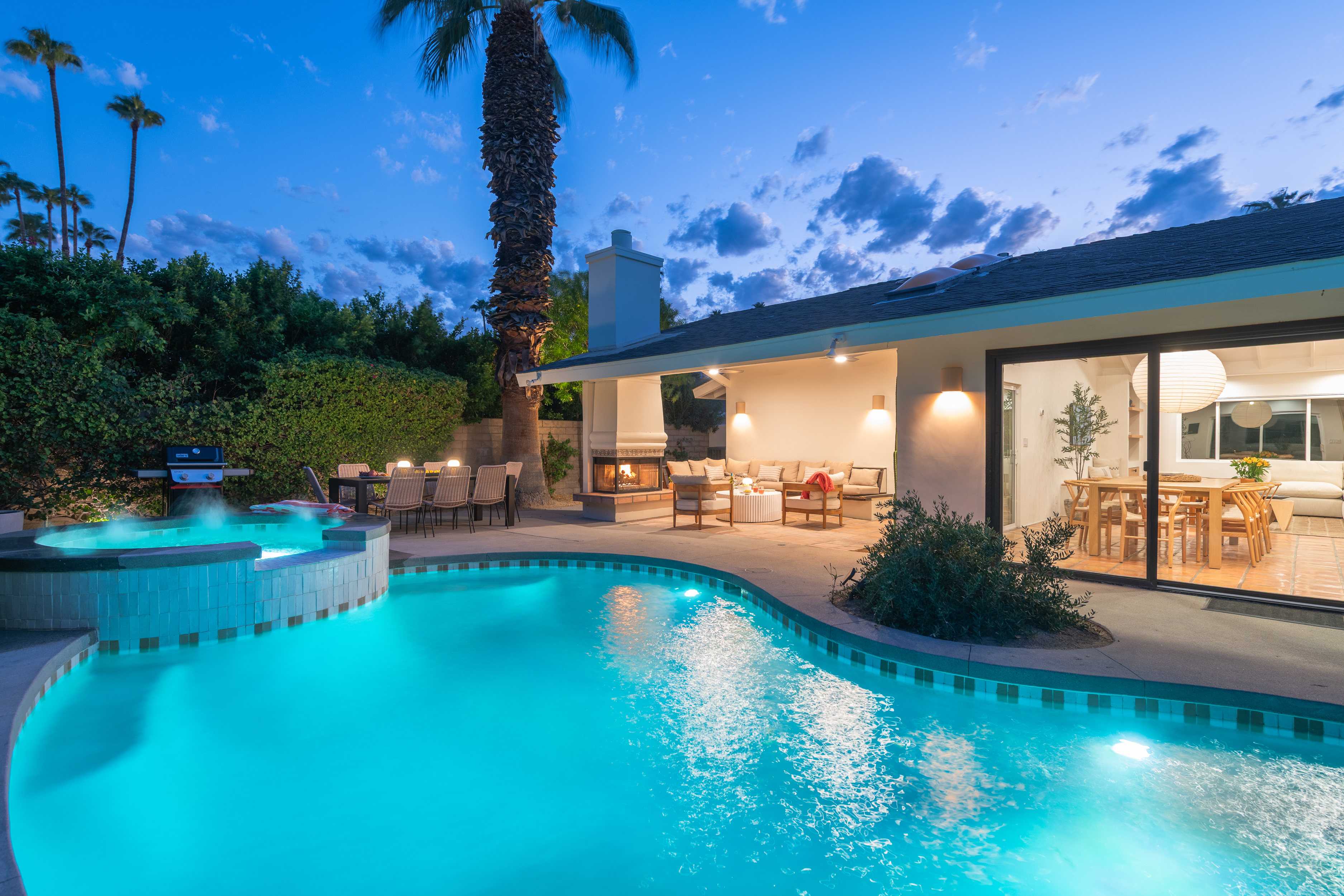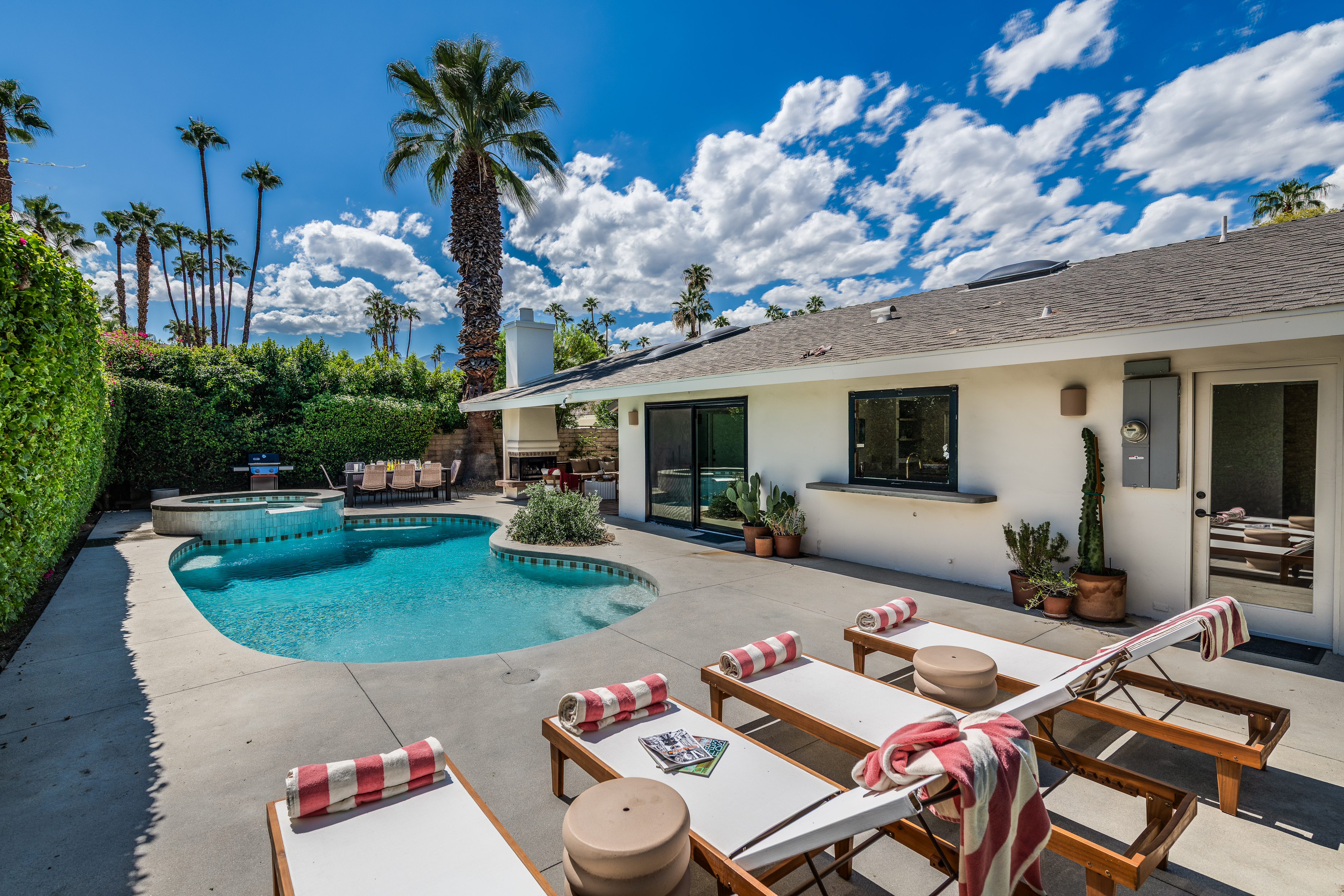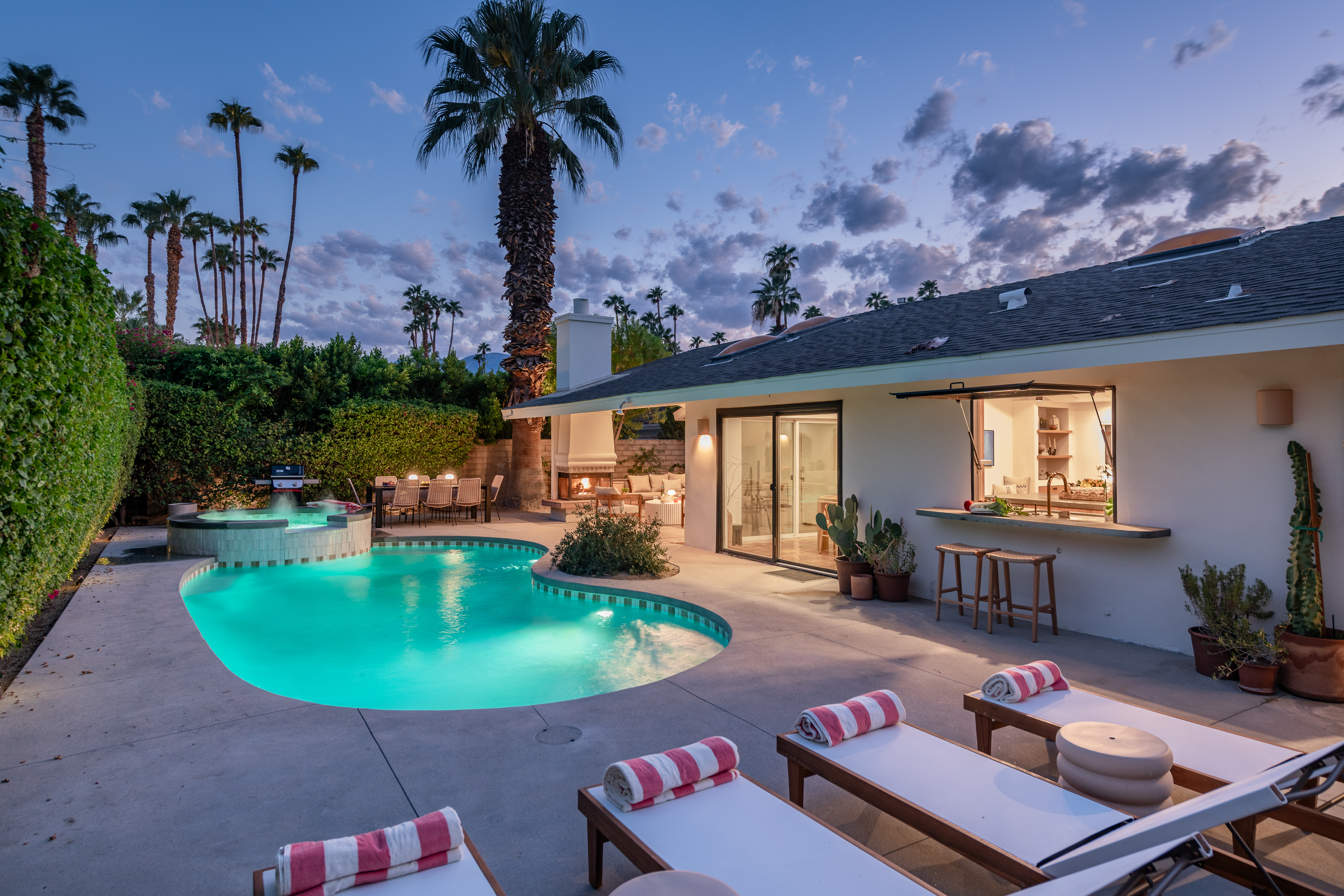 The home features 4 bedrooms, 3 baths and has been remodeled to embrace the original ranch design but is outfitted with modern comforts. The home offers indoor/outdoor living with a pass through window over the kitchen sink so poolside entertaining isn't neglected. That is coupled with multiple sliding doors to the pool and a gracious covered patio with an outdoor fireplace. Relaxed evenings are inevitable. The sparkling pool is just steps away from the house, paired with poolside dining and the hot tub offers very strong jets for any aches earned after golf or tennis.