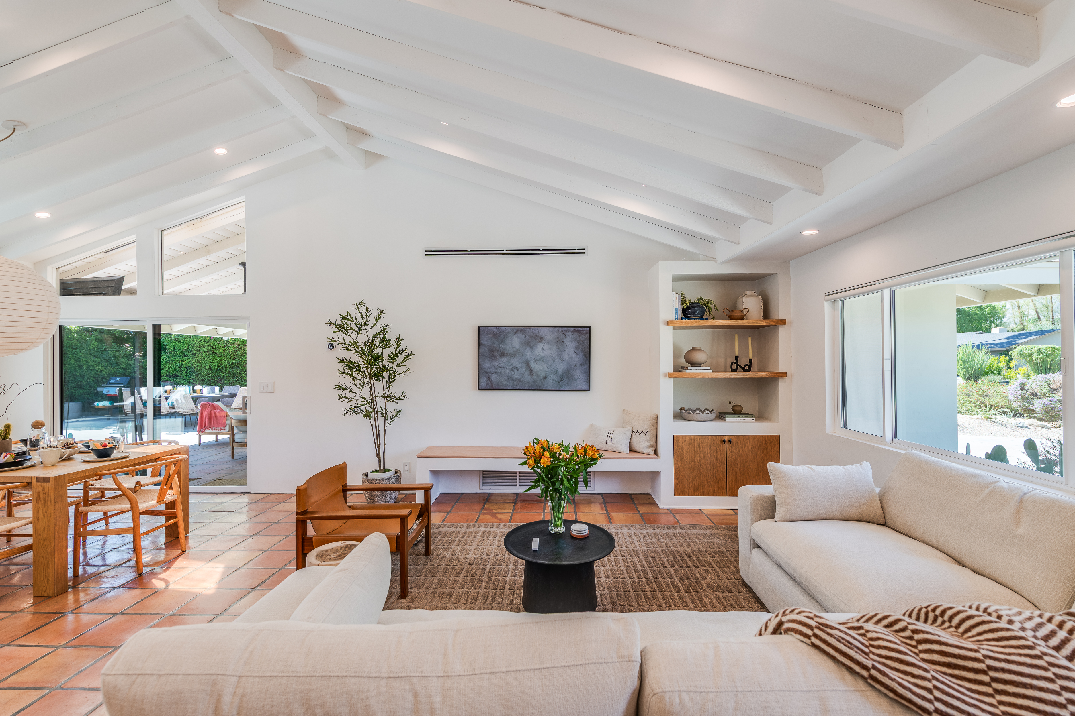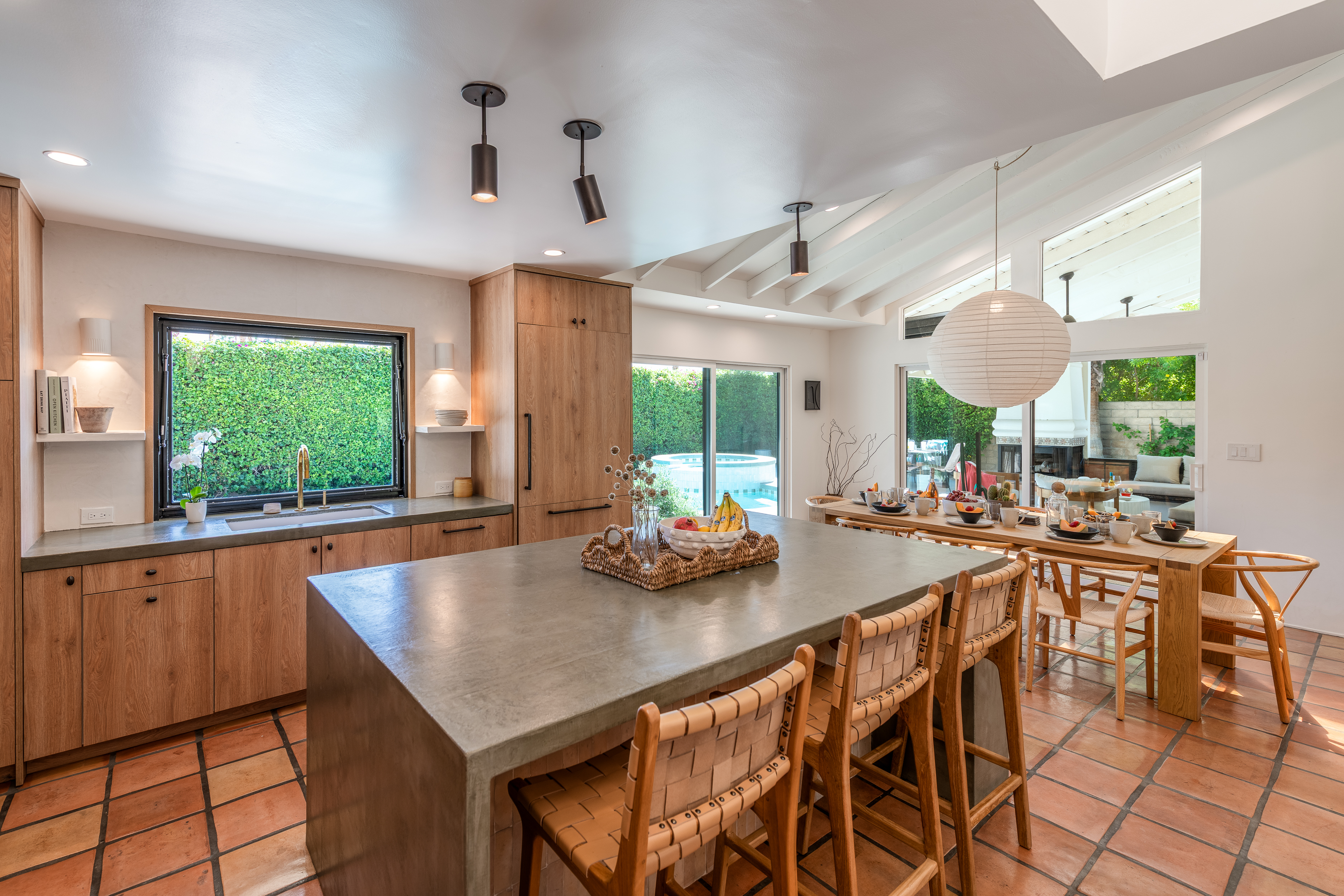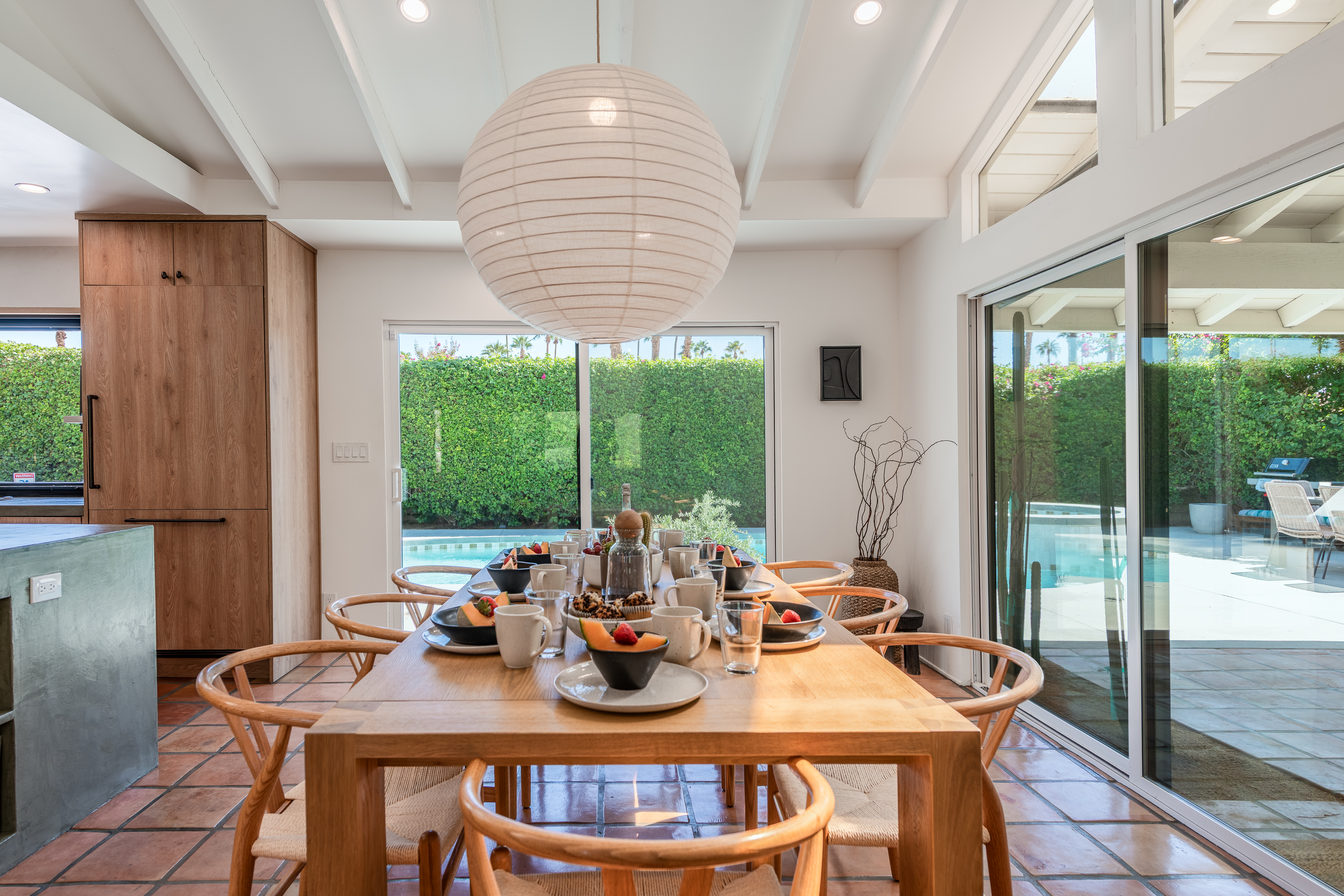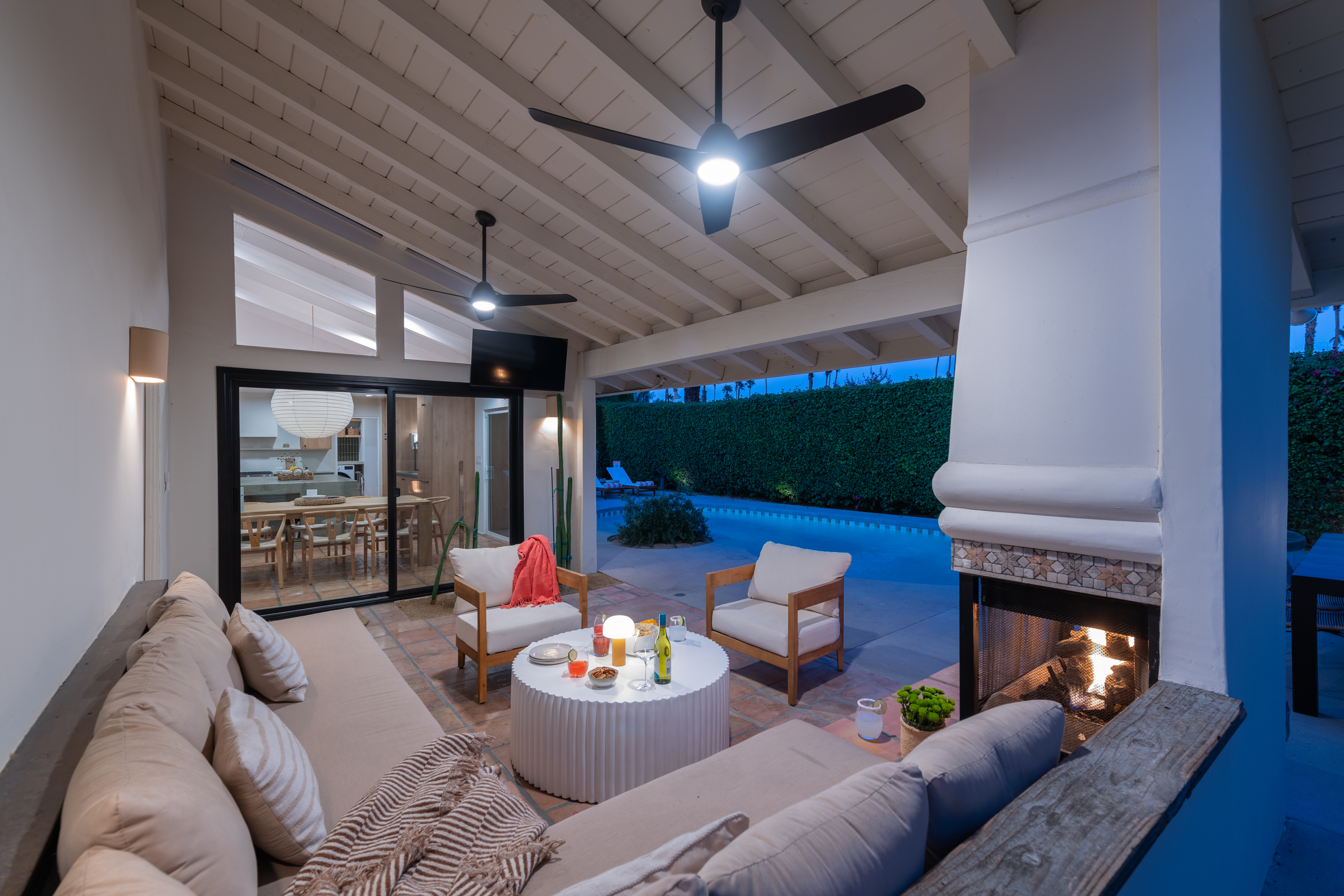 The home features 4 bedrooms, 3 baths and has been remodeled to embrace the original ranch design but is outfitted with modern comforts. The home offers indoor/outdoor living with a pass through window over the kitchen sink so poolside entertaining isn't neglected. That is coupled with multiple sliding doors to the pool and a gracious covered patio with an outdoor fireplace. Relaxed evenings are inevitable. The sparkling pool is just steps away from the house, paired with poolside dining and the hot tub offers very strong jets for any aches earned after golf or tennis.