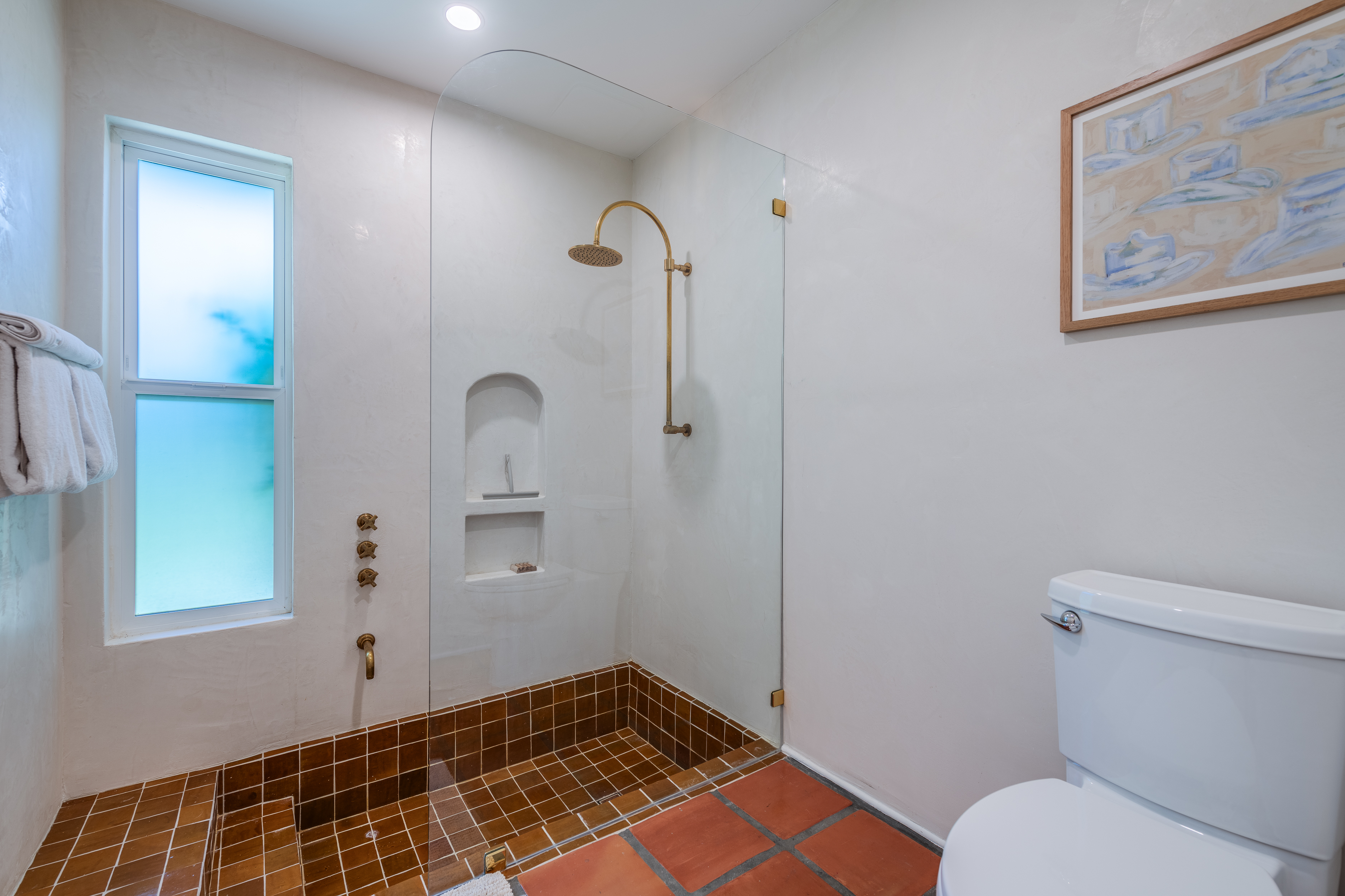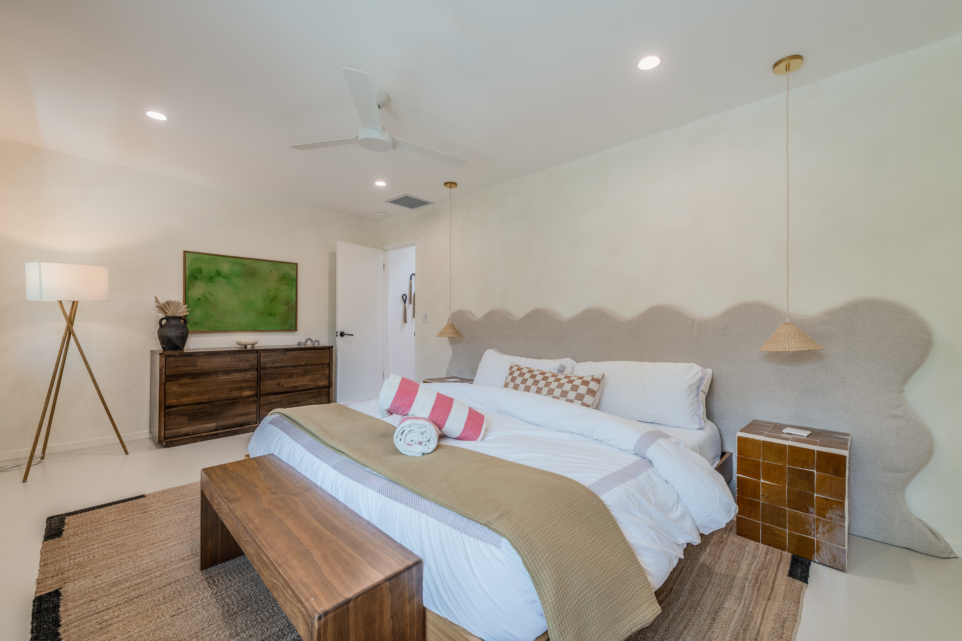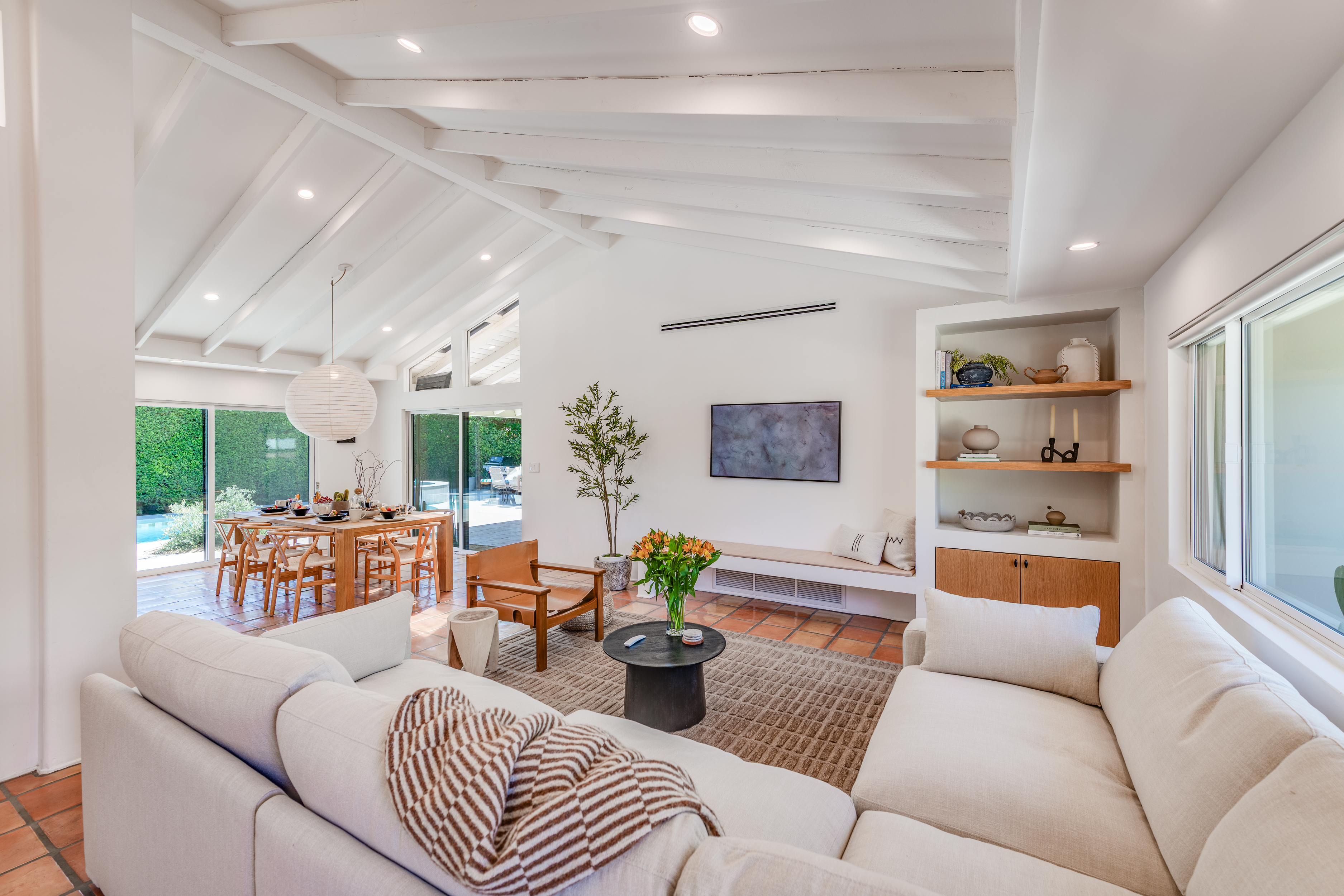 A hallway off the living room, to the left, takes you to the 4 guest rooms. Two guest rooms, one with twin beds and another with a queen bed, share a hallway bathroom. A third guest room features a king bed and an en-suite bathroom. The primary is a lovely retreat for the lucky occupant with sliders to the back yard. The en-suite primary bath features the original 'sunken' Grecian tub/shower.