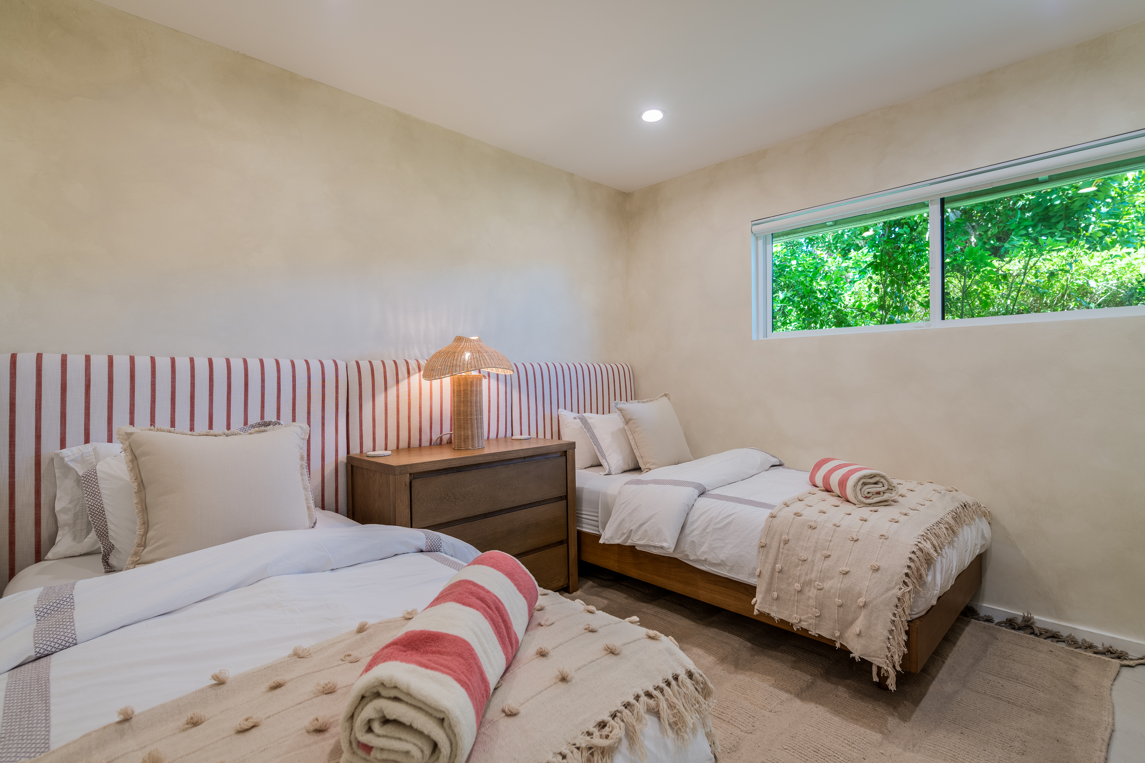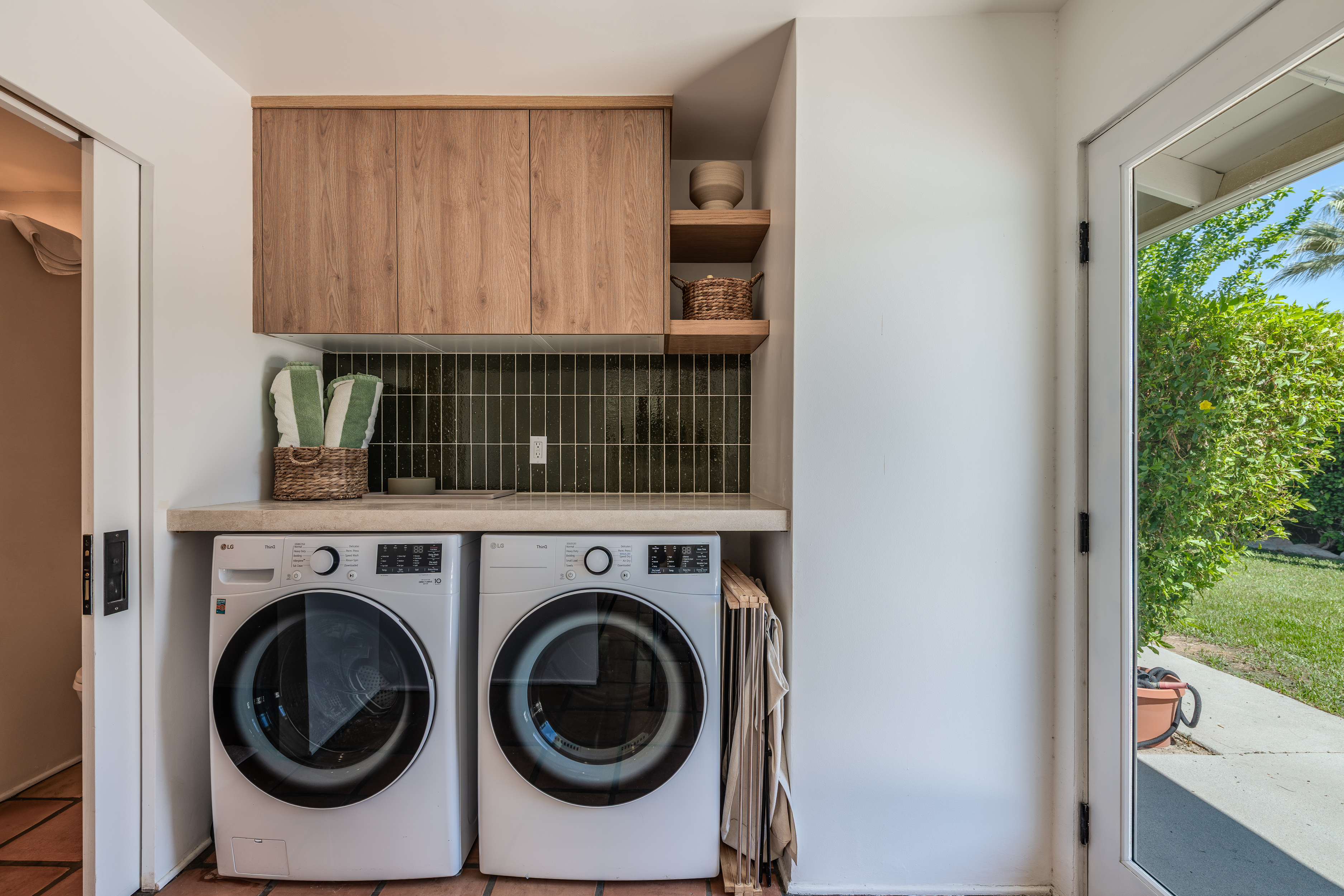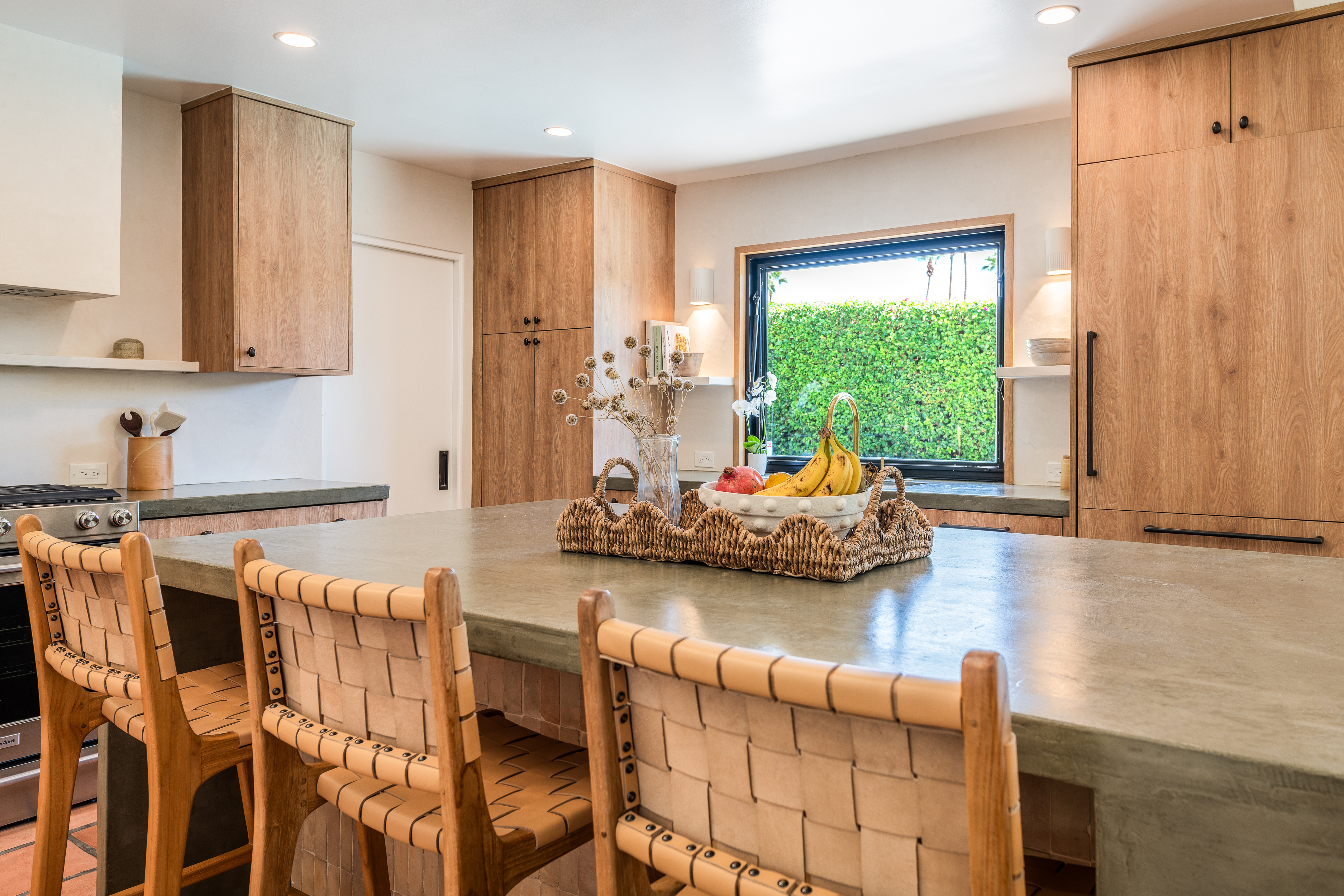 Entering the home you are swept into the open floor plan seeing the living, dining and kitchen areas ready to welcome you and your guests. Calming browns and sand-tones immediately put you at ease. The kitchen is modern with a large sink and all the modern appliances including a gas stove and oven, a large and chicly integrated refrigerator and freezer, wine fridge and dishwasher. The large kitchen island will make family entertaining a breeze; cautious eyes can easily watch children in the pool from the kitchen sink. Just beyond the kitchen is a laundry/wet room with a door to the pool.