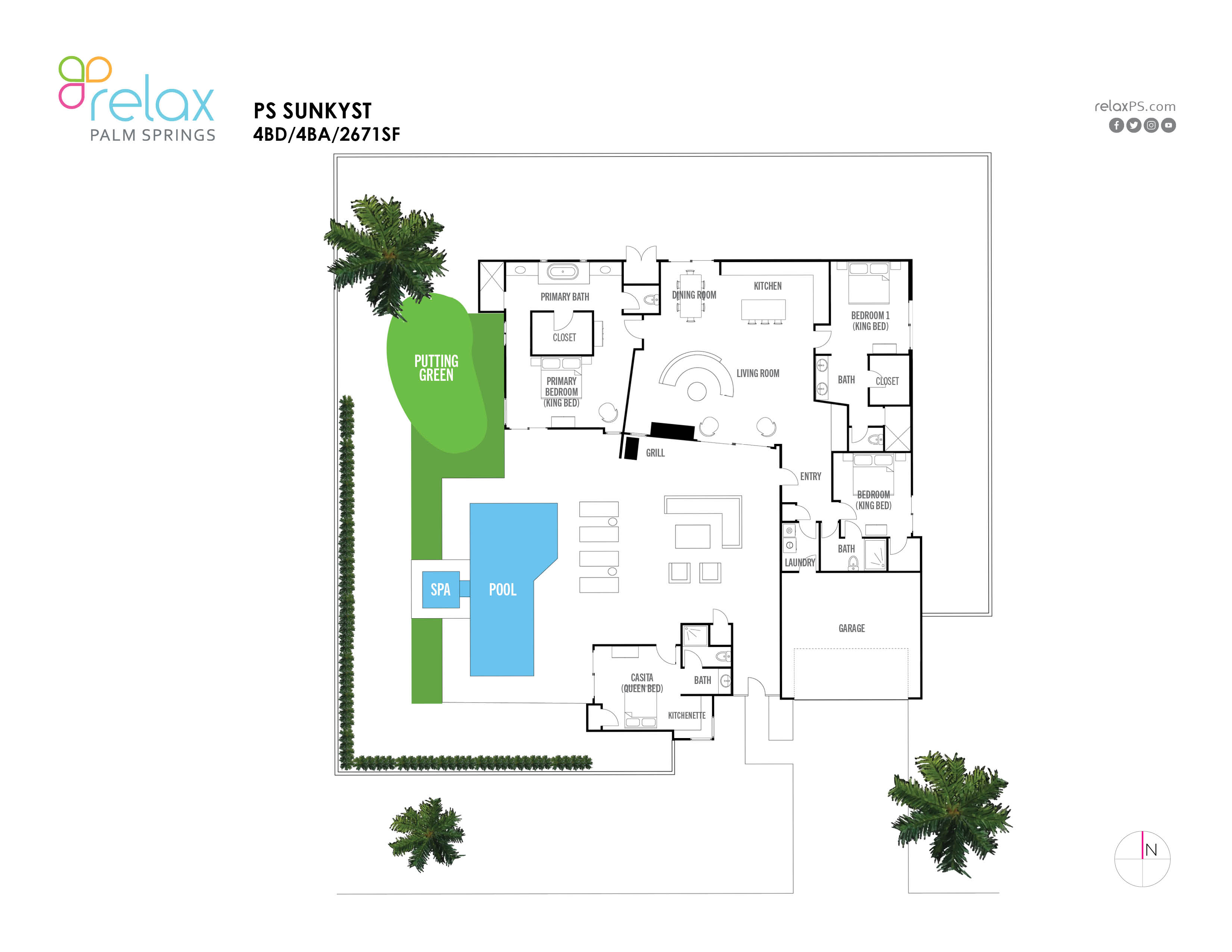 We got sun kissed at The Sunkyst! The property listing describes the home as spacious, elegant, and comfortable - and that doesn't come close to accurately listing the beauty of this property! For the home itself - it is beyond spacious and comfortable! Each of the rooms is large and has its own bathroom (huge plus for a group staying here) - and everything was designed meticulously. You can tell that the homeowners take great care in making this a great experience for their guests. The kitchen was fully equipped - the bar was an unexpected and nice touch - and they even provided pool toys (and a putting green in the backyard!!). As for the location - this really can't be beat! It is about a 5-minute drive from the PSP airport, and a five-minute drive to town. It is centrally located to anything you may need - though truthfully we rarely left the house because it had everything we needed; and wanted for our vacation! I will definitely be staying here again should my travels take me back to Palm Springs.